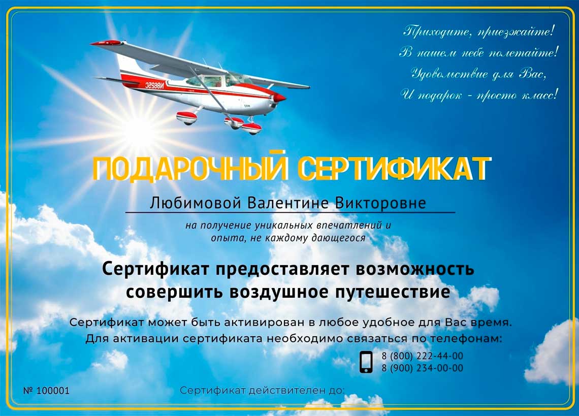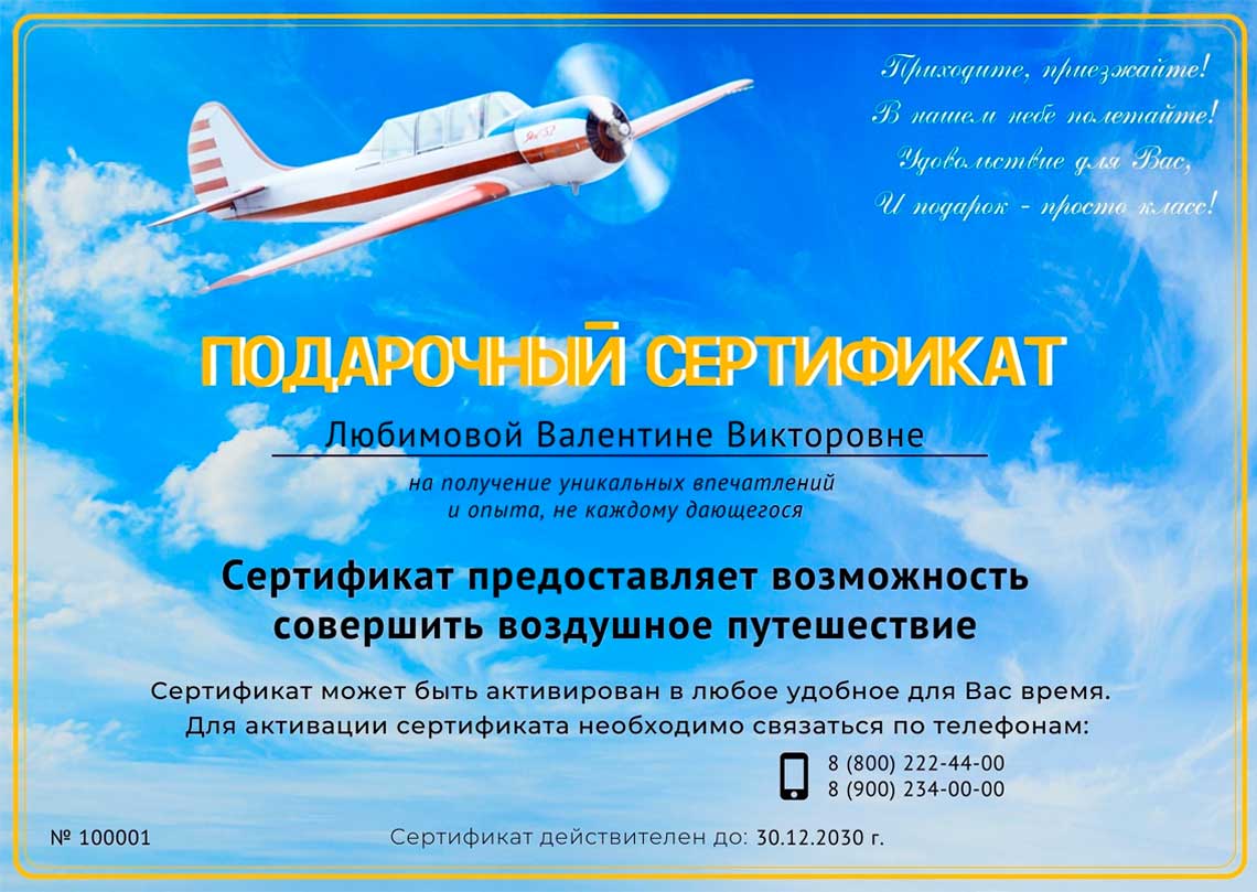 Подарочный сертификат на выполнение полёта на самолёте в электронном виде направляется на электронную почту.
