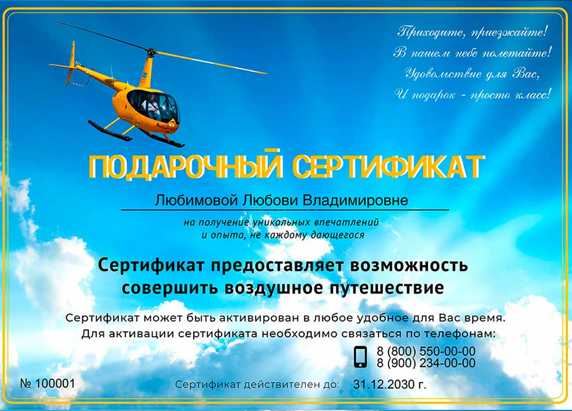 Для оформления подарочного сертификата необходимо направить на e-mail zakaz@fly-present.ru Фамилию, Имя и Отчество человека, на чьё имя подарочный сертификат оформляется.